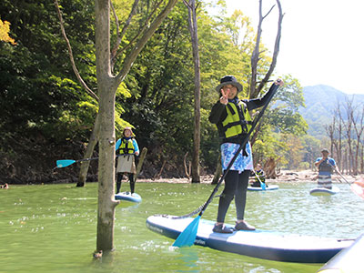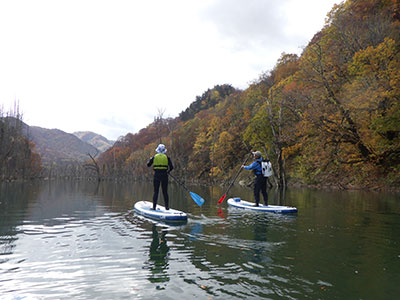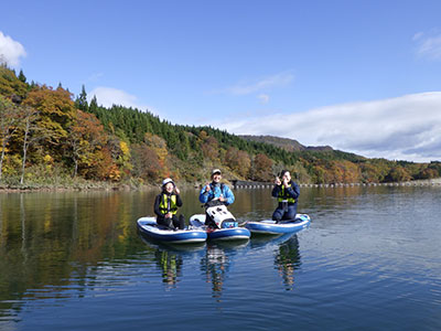 白神山地から流れる大川と暗門川が合流する美山湖をSUP(スタンドアップパドル)でのんびりゆったりツーリング。水上からしか見ることのできない風景が広がり自然を肌で感じることができます。SUPの上から写真を撮ったり、暑い季節は川遊びもできちゃう。初心者でも安心。バランスの良いSUPを御用意しております。はじめにガイドが漕ぎ方など注意点を指導いたしますので、安心して参加できます。ツアーの後は、西目屋村内にある3つの温泉施設のいずれかにご入浴いただけます。